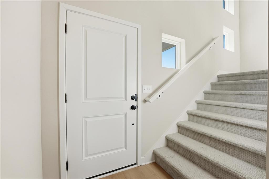 Our Basswood home plan with our Design Series 3, Package D features a modern, open layout designed for comfortable living. The main level highlights a spacious kitchen with a large island that overlooks both the dining and great rooms, making it perfect for entertainment and family gatherings. Additionally, a sizable home office on this level provides a dedicated space for work or study. Upstairs, the primary bedroom is a luxurious retreat with a spa-like bathroom, complete with an oversized countertop, dual sinks, and a walk-in shower. The second floor also includes a large full bath for shared use and a conveniently located laundry room adjacent to the 3 bedrooms. Photos from a previous model home.